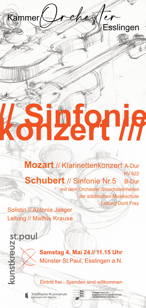 Im Mai gestalten wir wieder ein Muttertags-Konzert im Rahmen der Veranstaltungsreihe Kunstkreuz Sankt Paul. Aufgeführt werden Sätze aus dem Concerti per Archi von N. Rota, das Konzert Nr. 5 A-Dur für Violine und Orchester von W.A. Mozart und die Symphonie Nr. 40 F-Dur von J. Haydn. Alle sind am Samstag, 9.5.2026 um 11:15 Uhr in die Kirche Sankt Paul in Esslingen zu diesem Konzert herzlich eingeladen. Der Eintritt ist kostenlos, wir freuen uns aber über eine Spende.